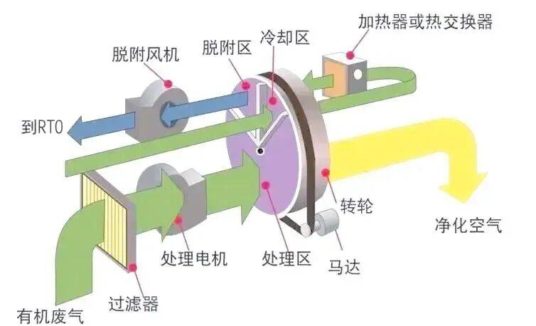 沸石转轮技术巧妙地解决了这一难题,其核心在于“先浓缩,后处理”的治理思路。整个过程在一个持续缓慢旋转的、装有沸石分子筛吸附剂的转轮中完成,主要分为三个区域: